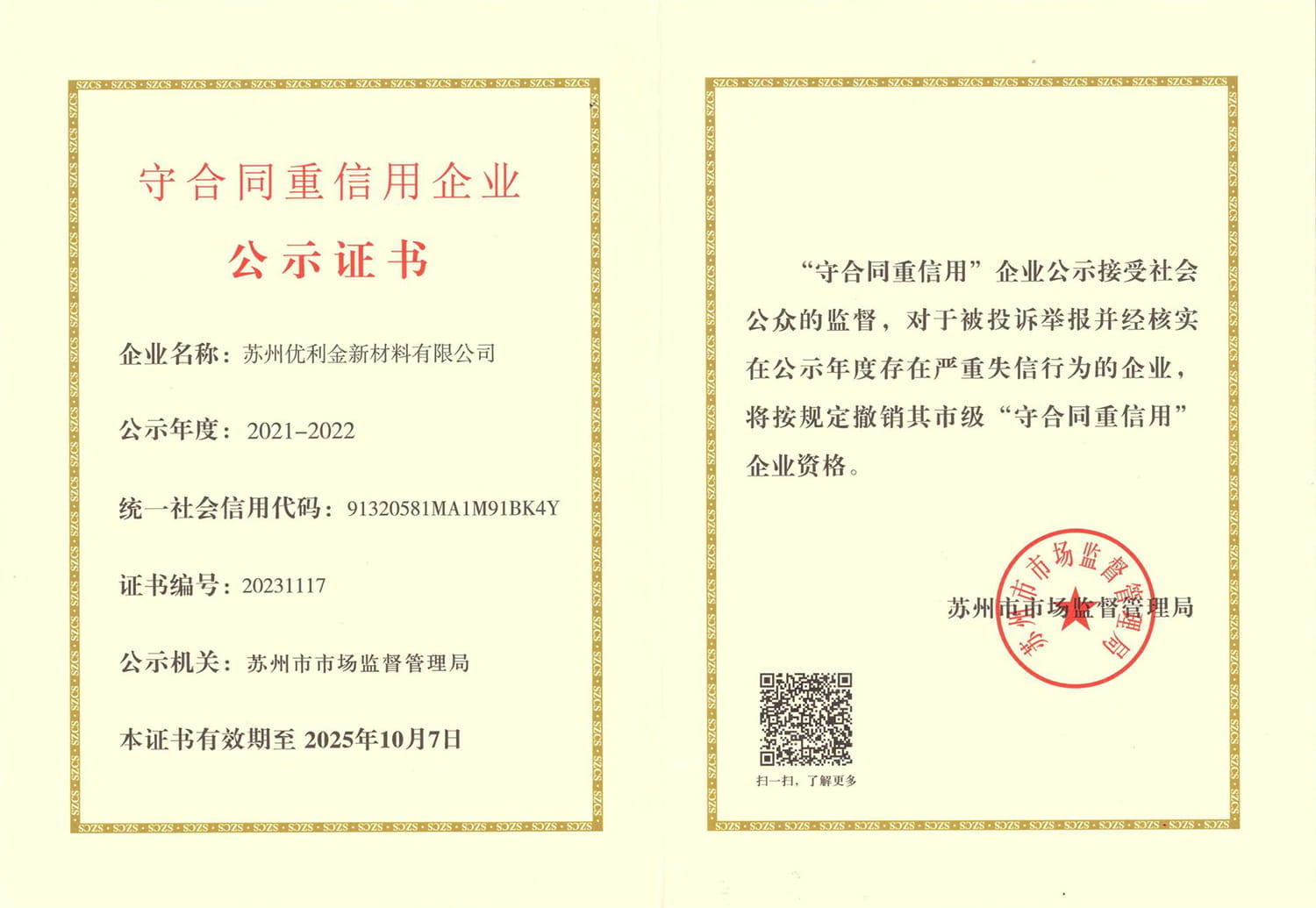 2023年11月,公司获评“江苏省民营科技企业”,获评苏州市“守合同重信用企业”。